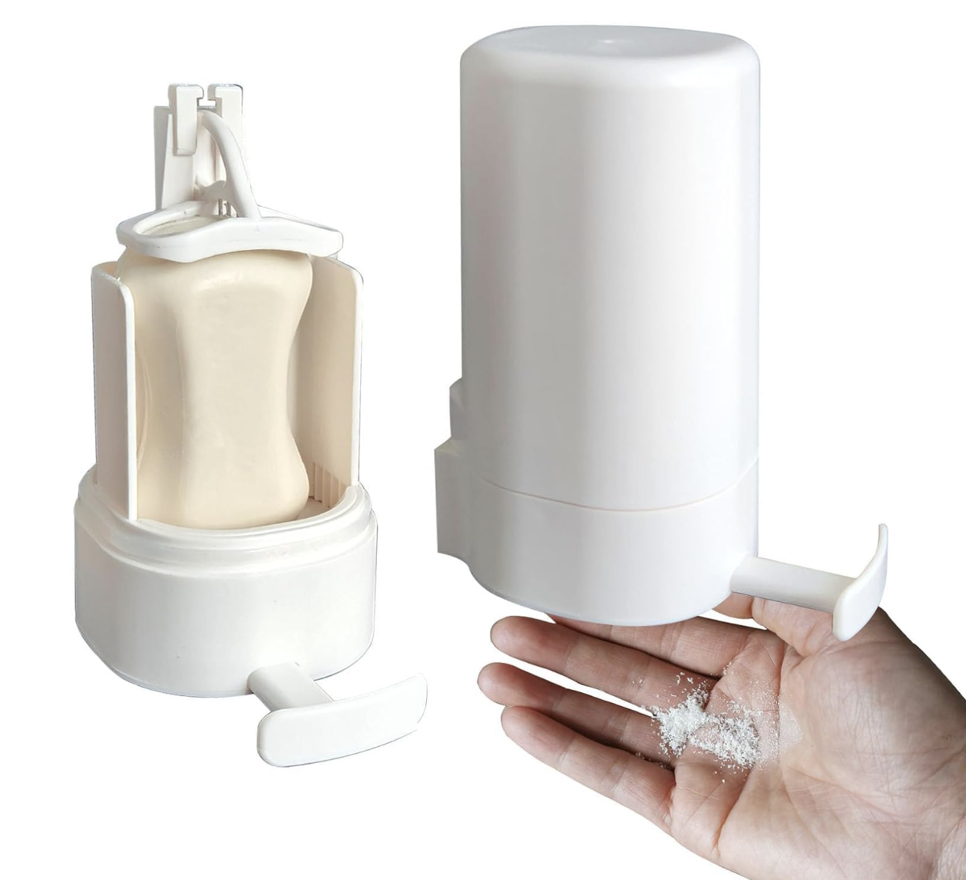 Instead of grabbing a slippery bar, you just press down and it grinds the soap into soft powder straight into your hand. The powder melts into a rich lather instantly. No slipping. No slime. No wasted soap.